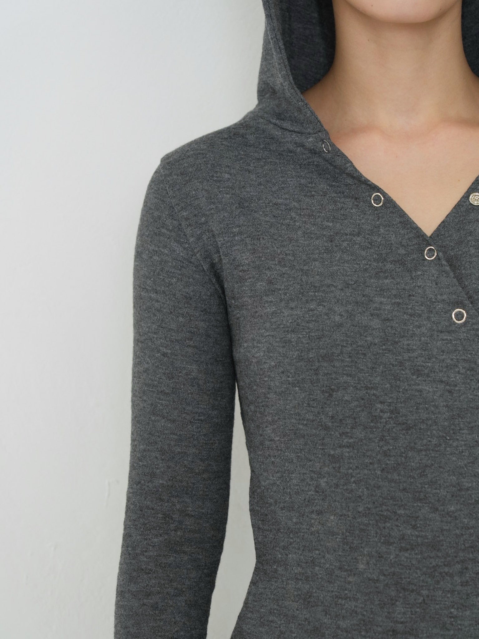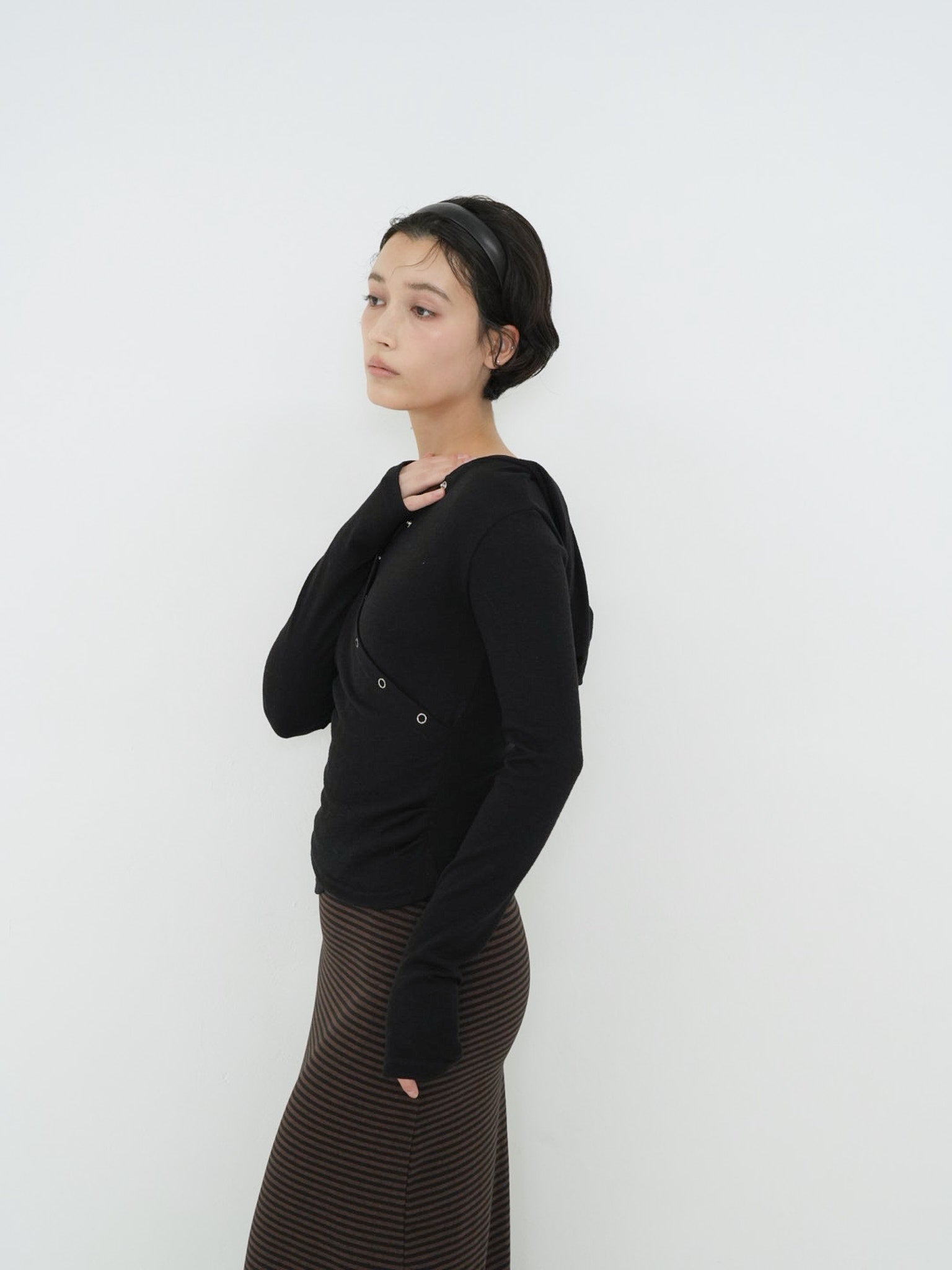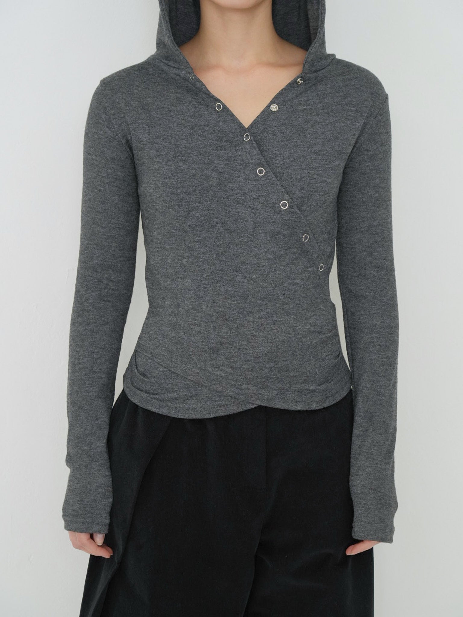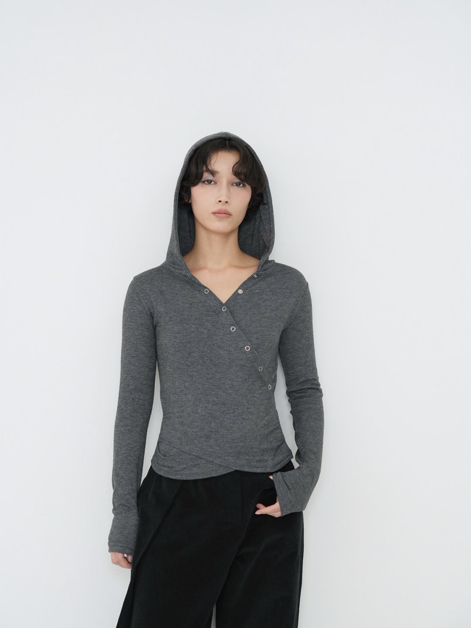 斜めに走るクロスボタンデザインが目を引く、モード感漂うフーディートップス。