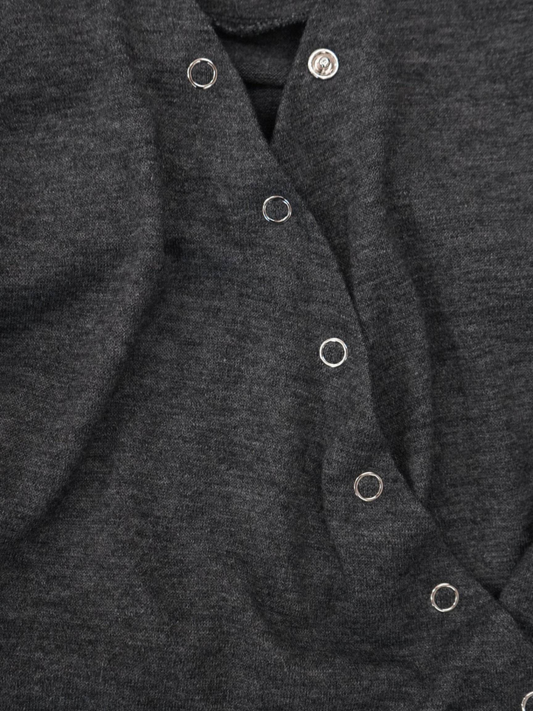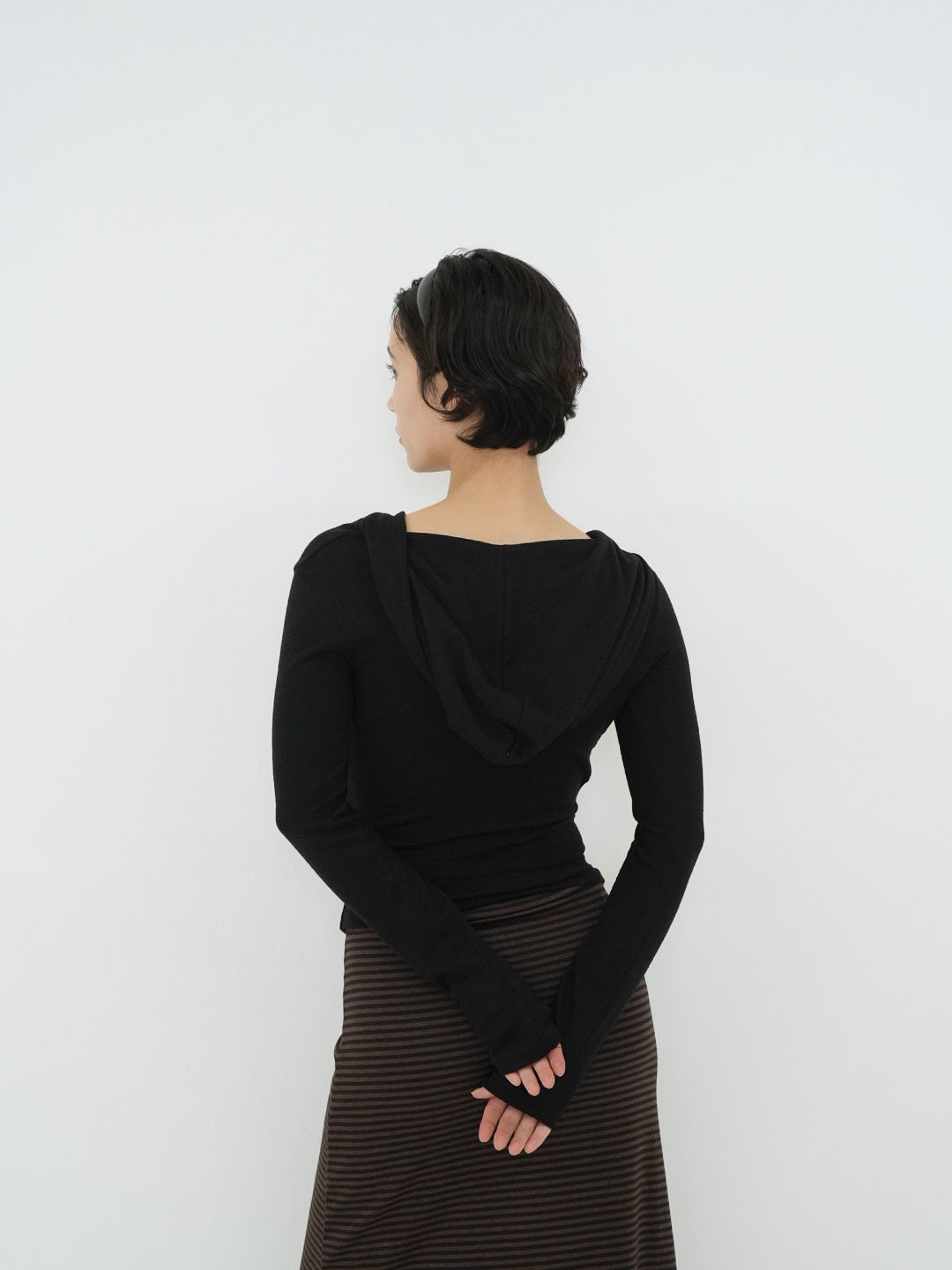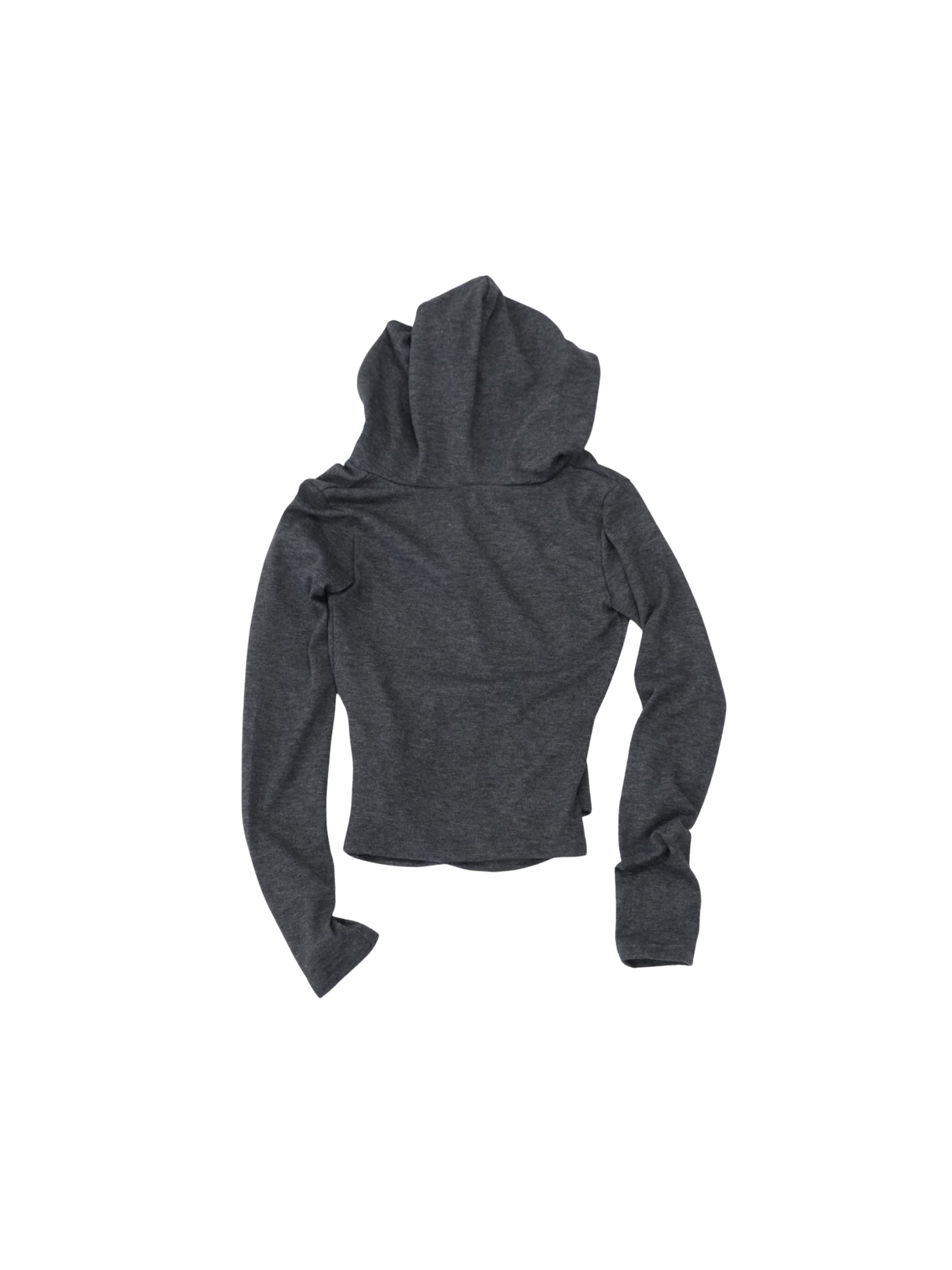 アシンメトリーなボタンラインがシルエットに動きを生み、シンプルなフーディーとは一線を画す存在感。