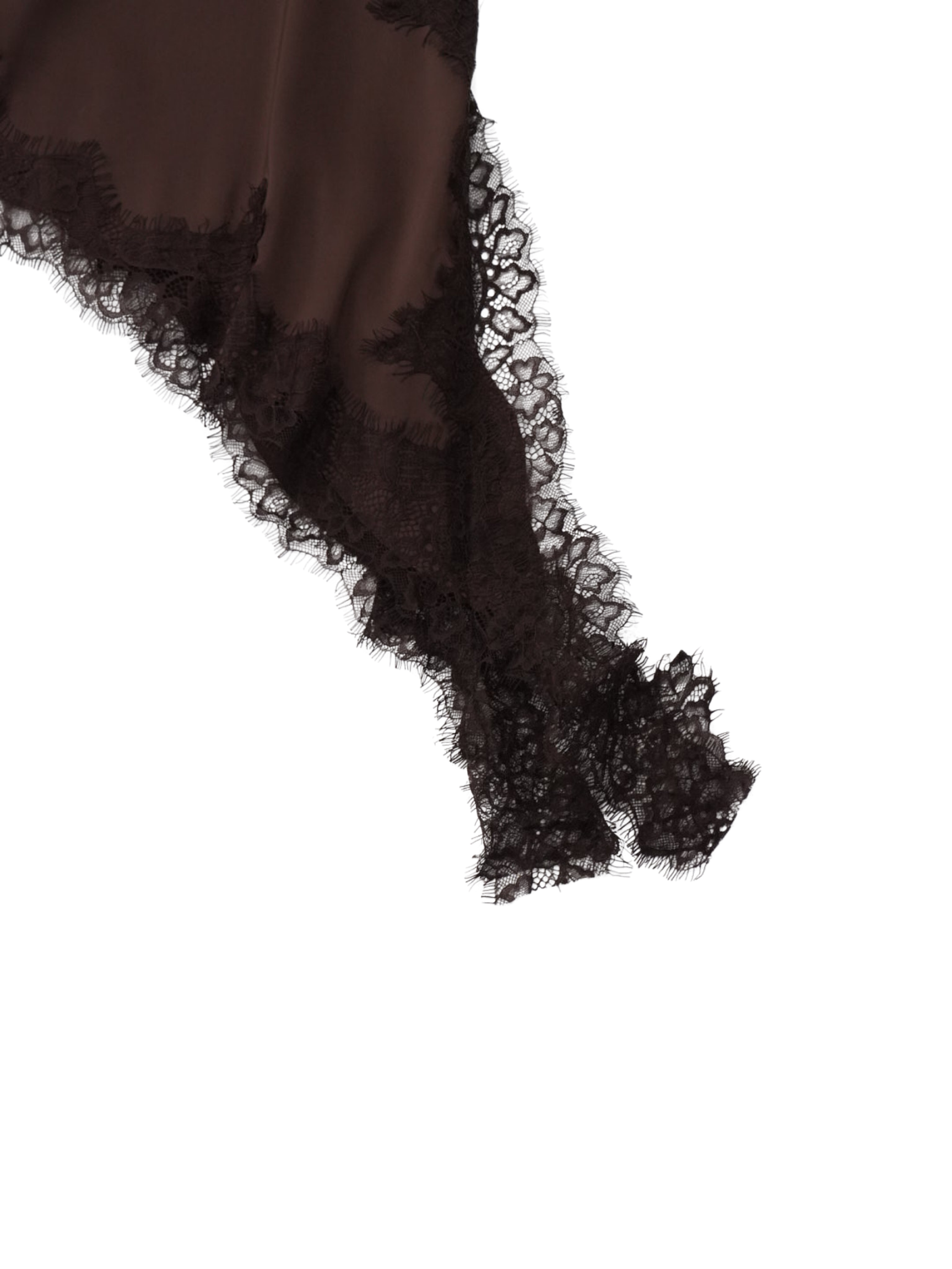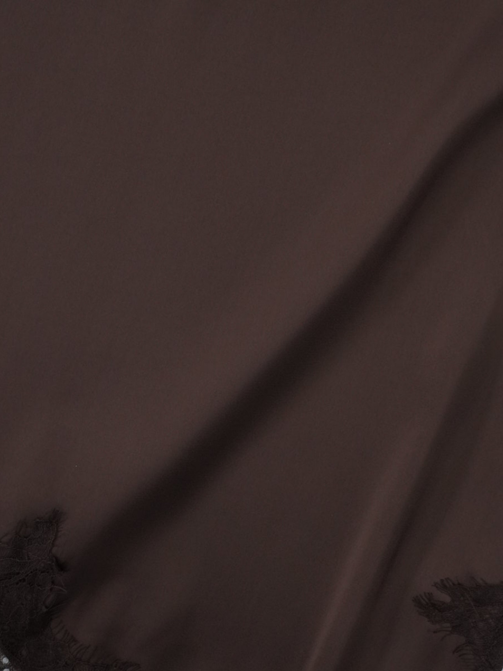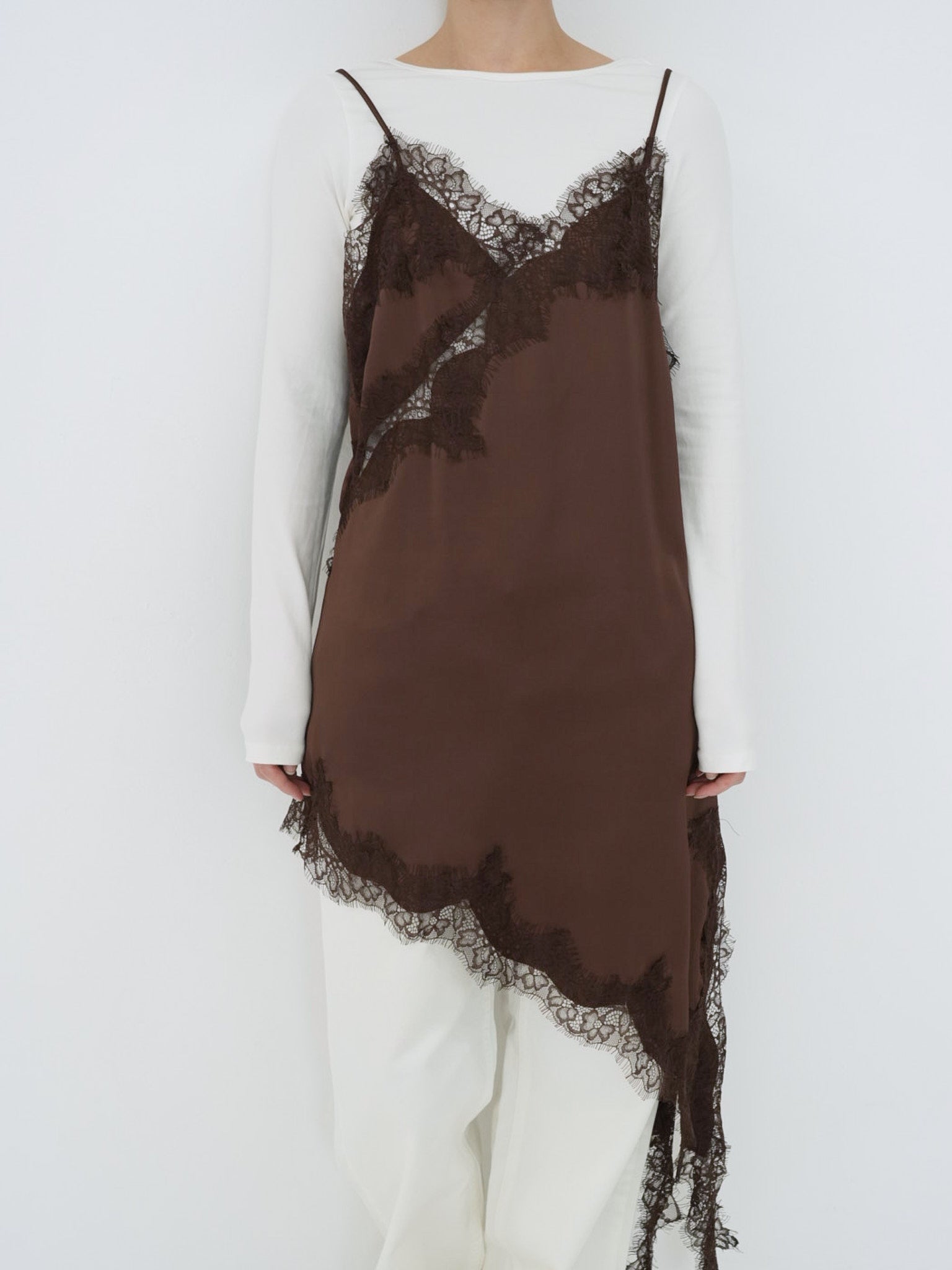 艶やかなサテン生地に、斜めに走るレースラインを組み合わせたエレガントなスリップドレス。