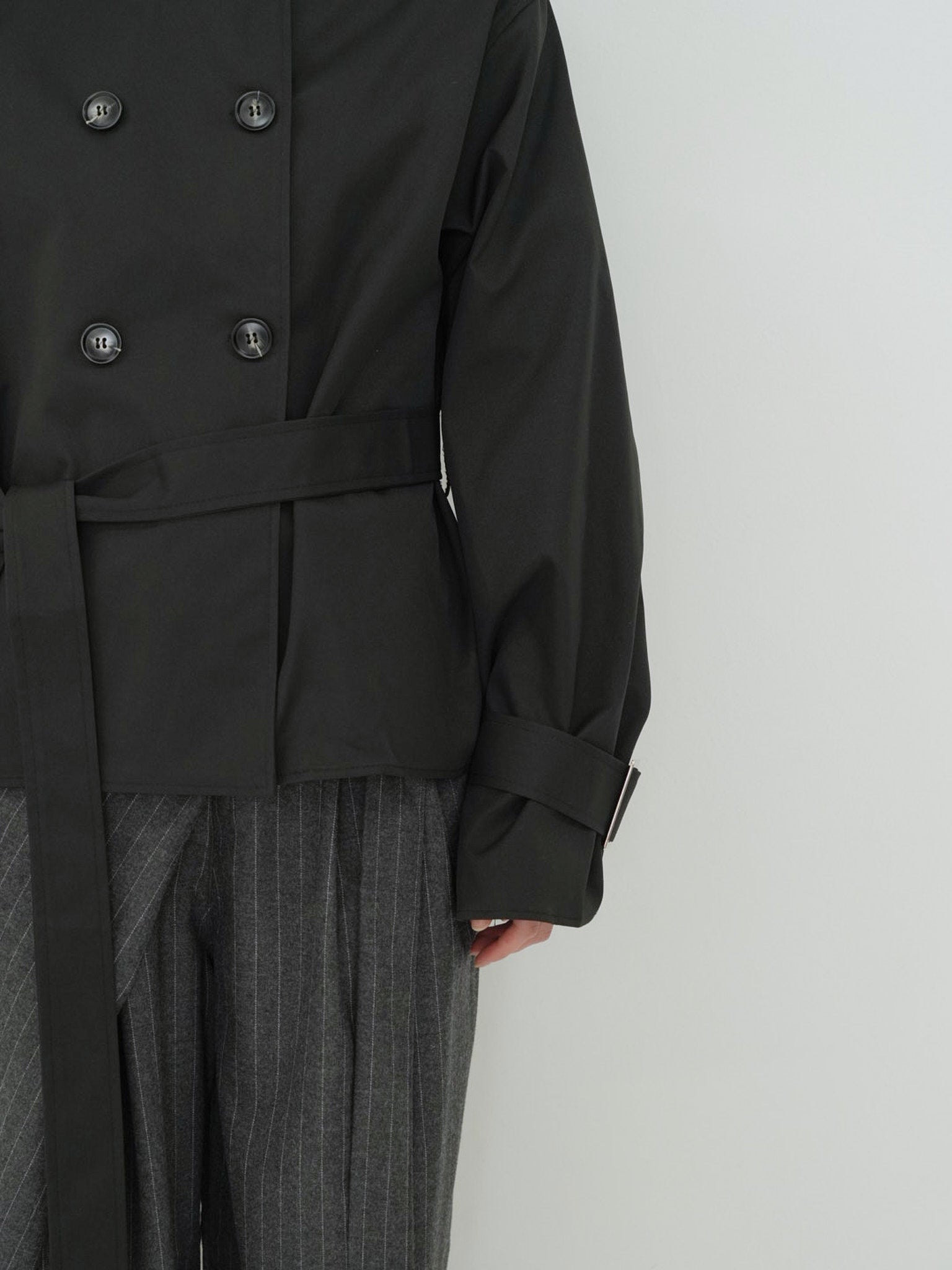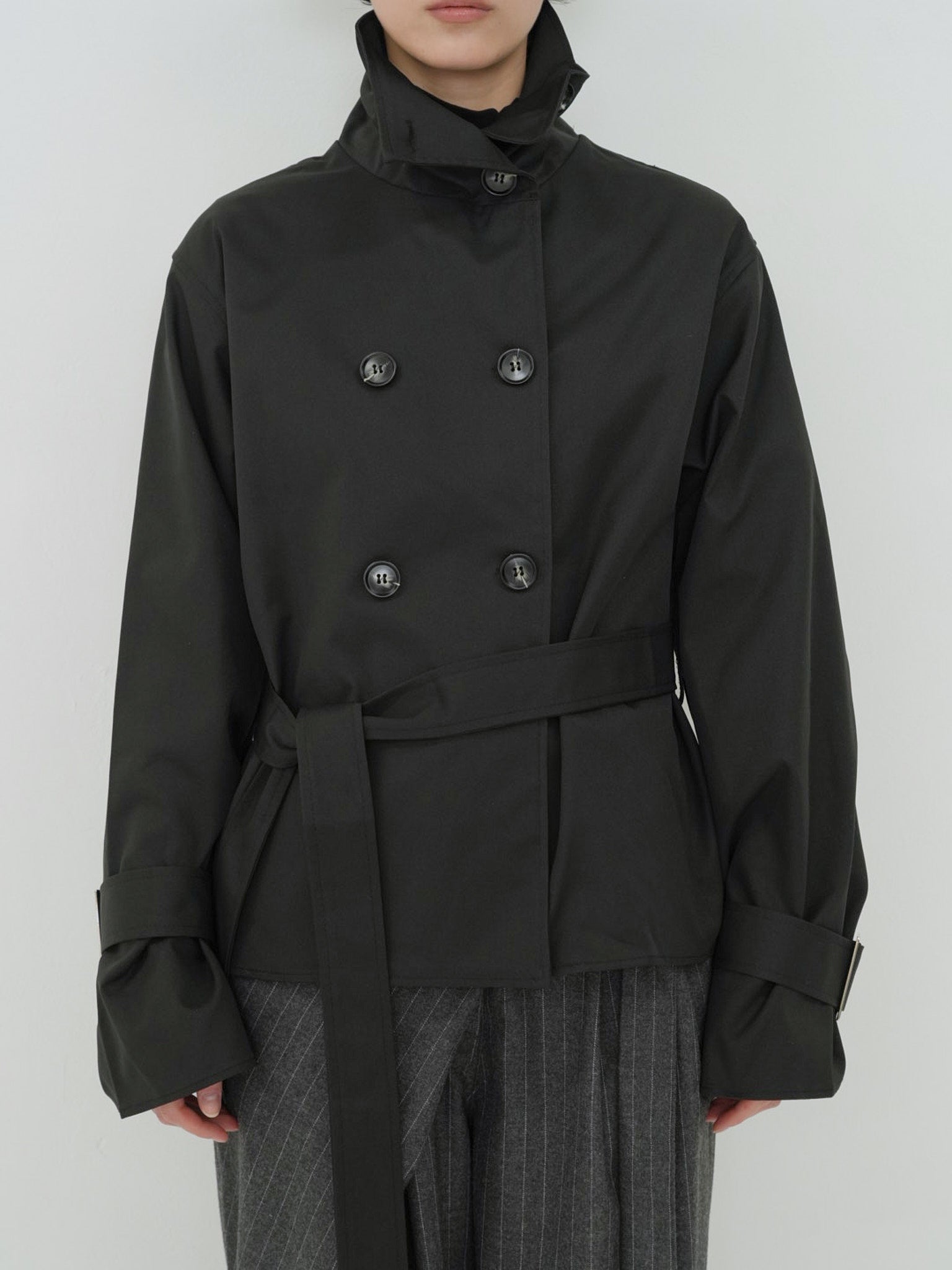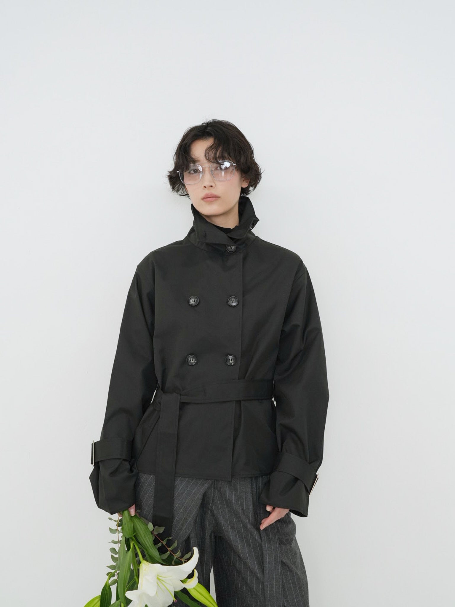 高めの襟とダブルボタンが上品な印象を与える、トレンチ風のショートジャケット。