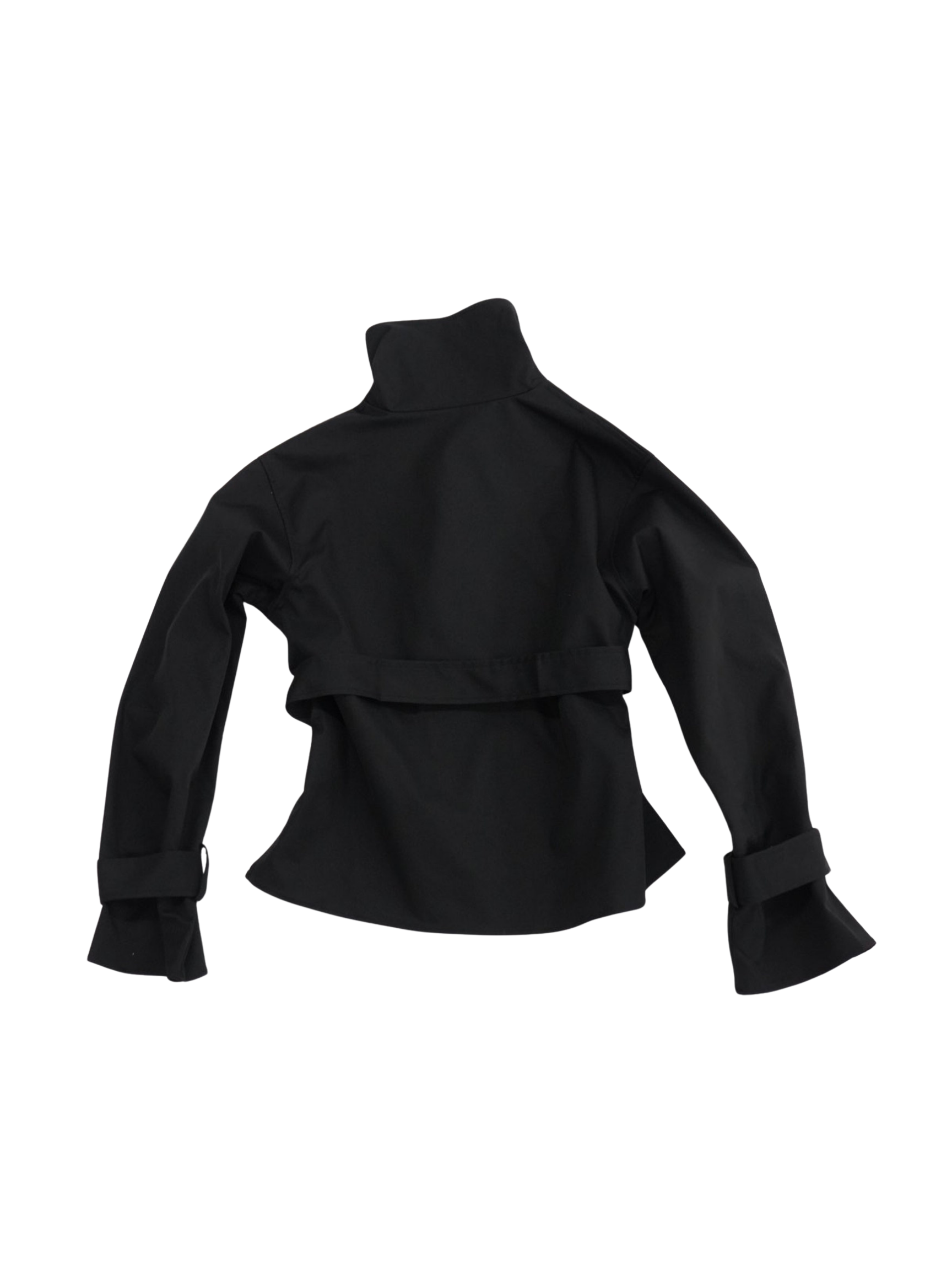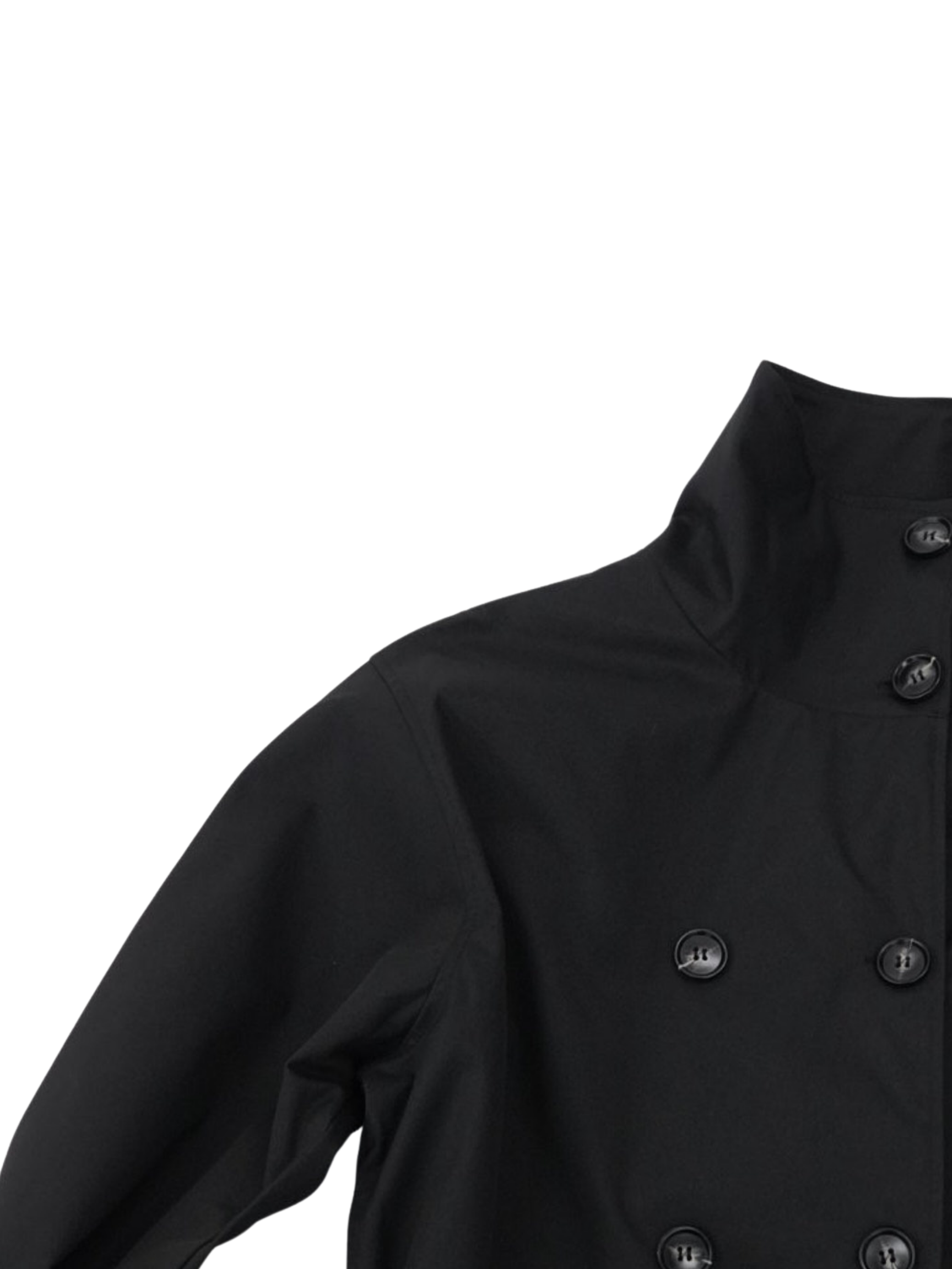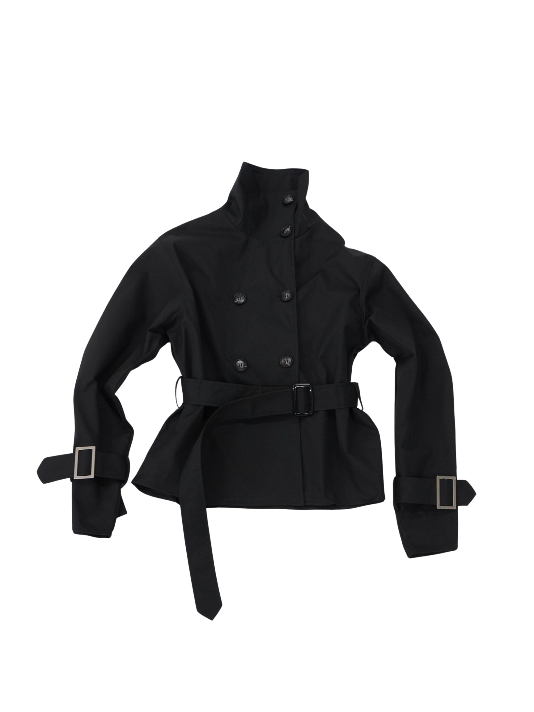 高めの襟とダブルボタンが上品な印象を与える、トレンチ風のショートジャケット。