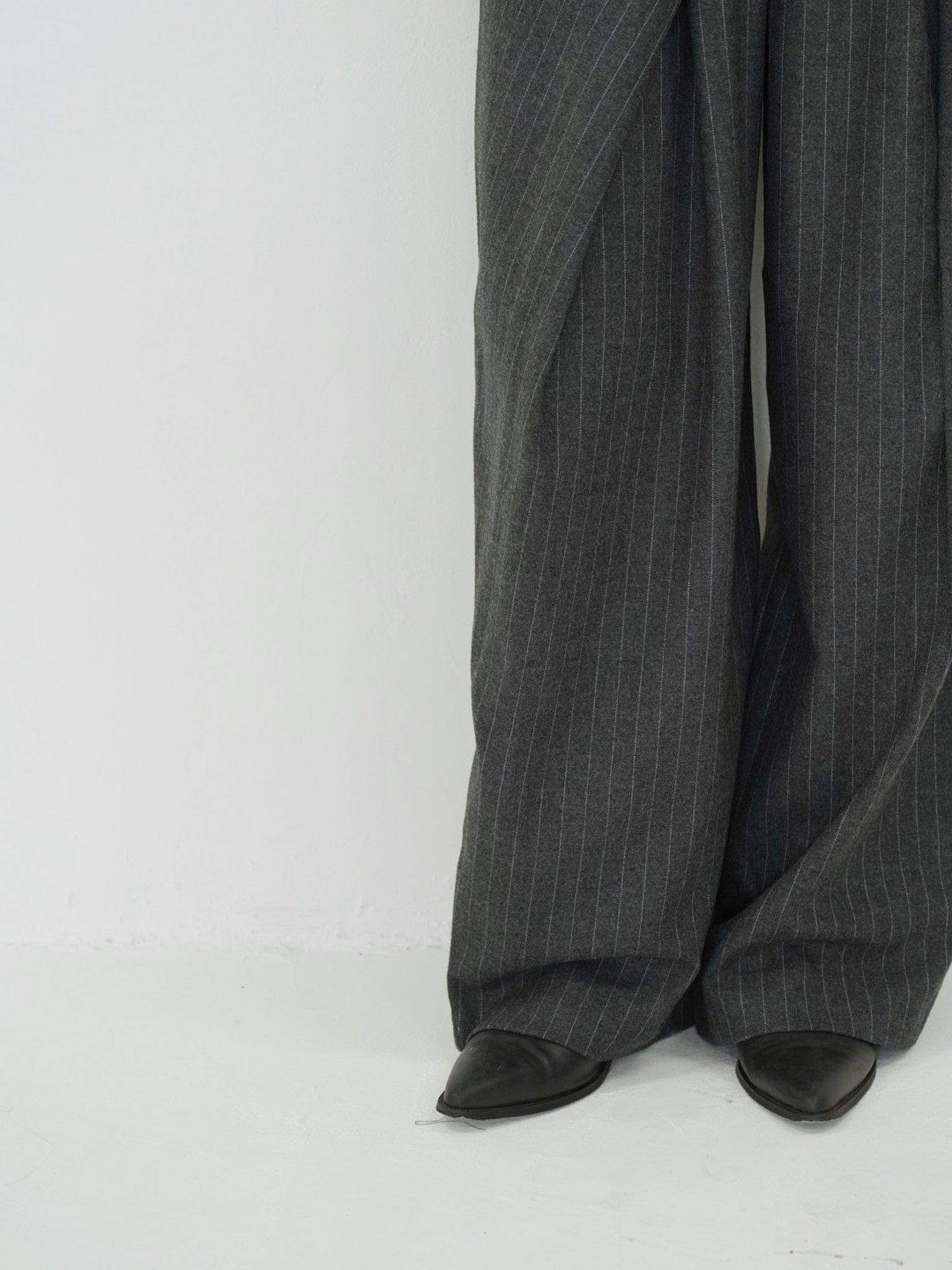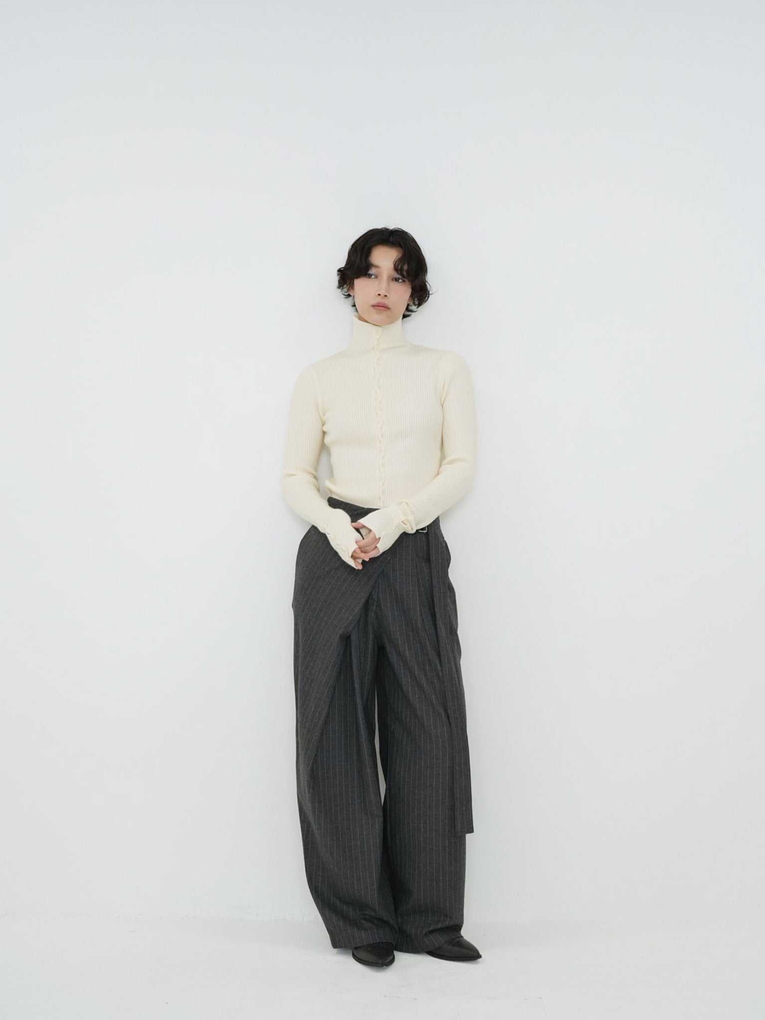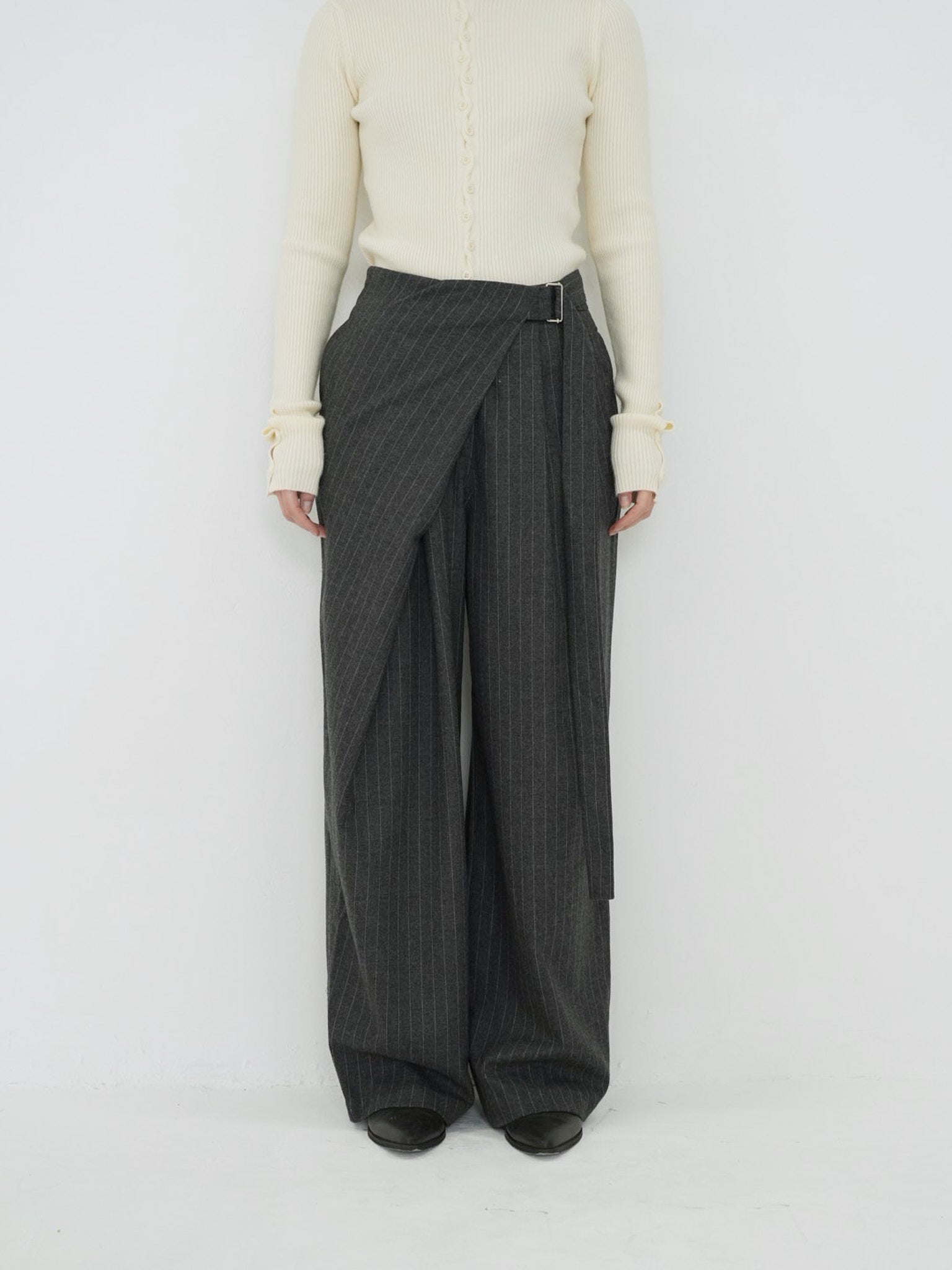 クラシックなピンストライプに、ラップデザインを組み合わせたモード感のあるワイドパンツ。