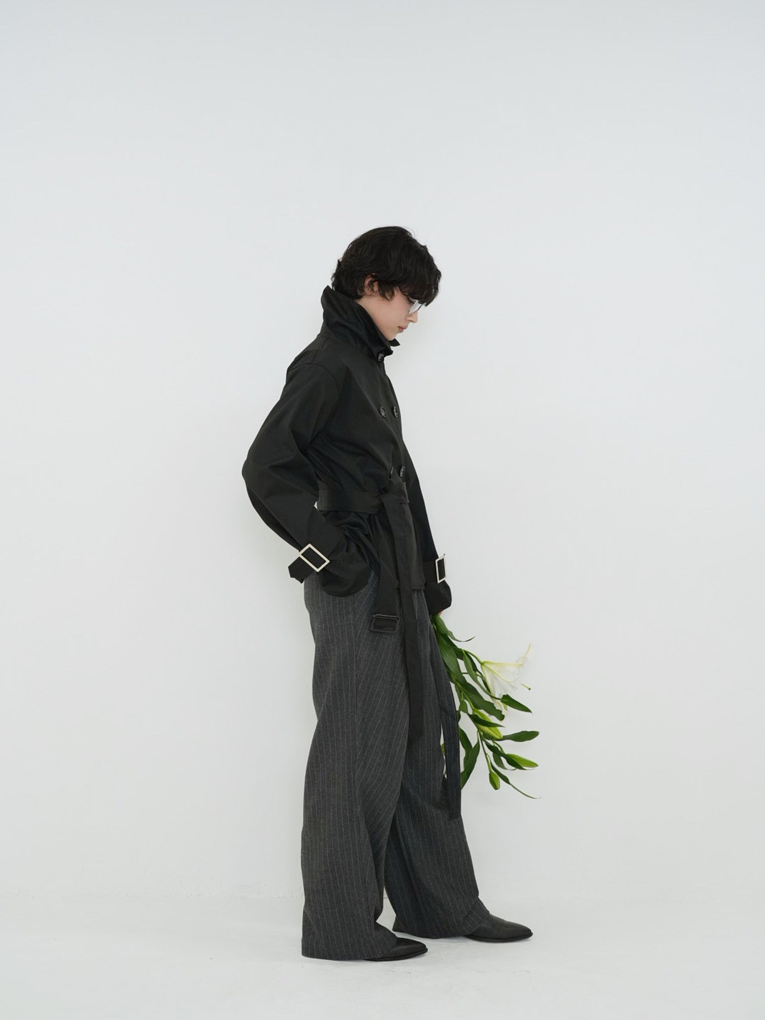 ウエストの巻きディテールとバックルがスタイルに立体感を生み、シンプルなトップスを合わせるだけで洗練された印象に仕上がります。