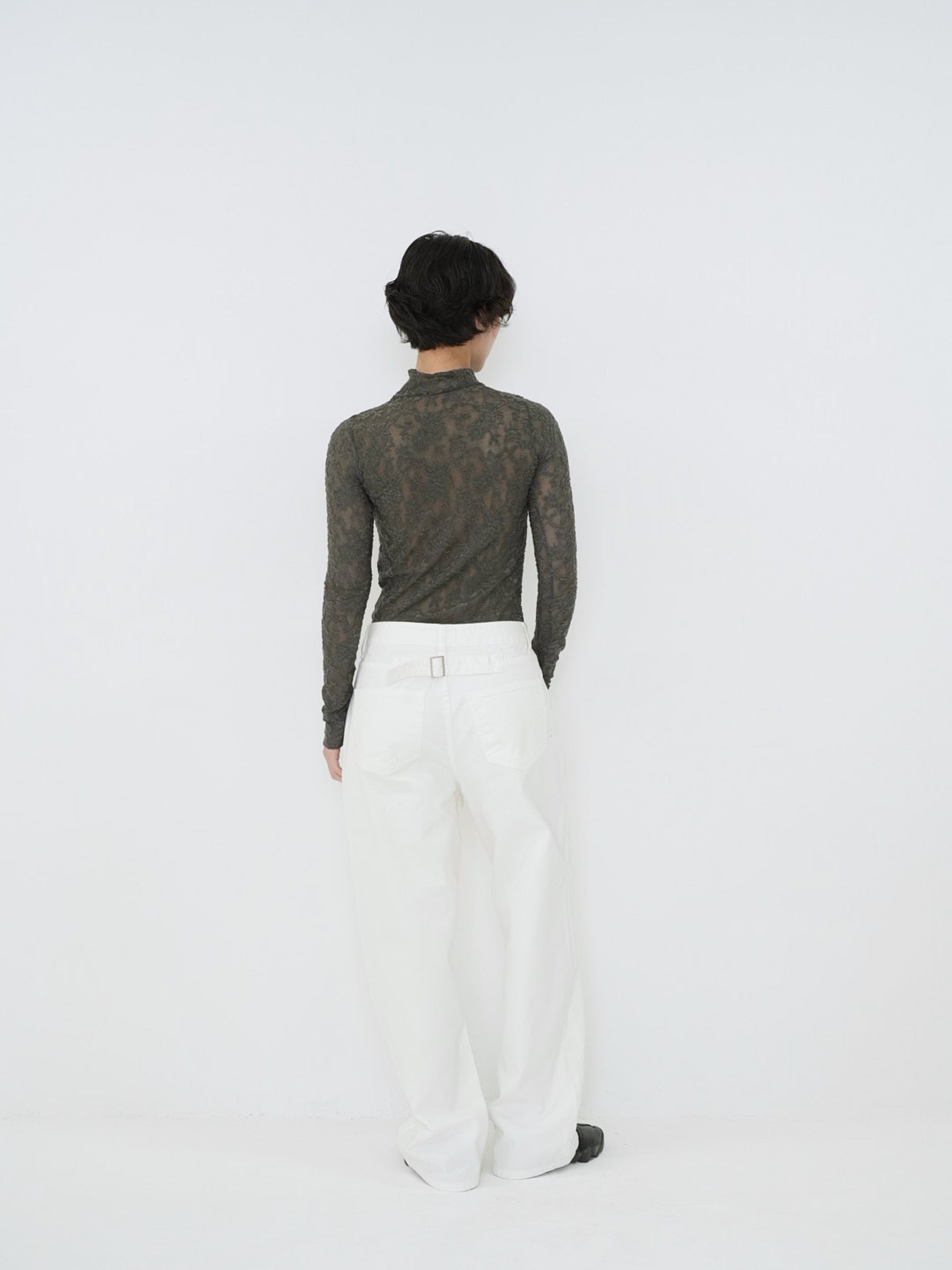 ウエストの同素材ベルトがシルエットにメリハリを加え、バックポケットのデザインがさりげないアクセントに。